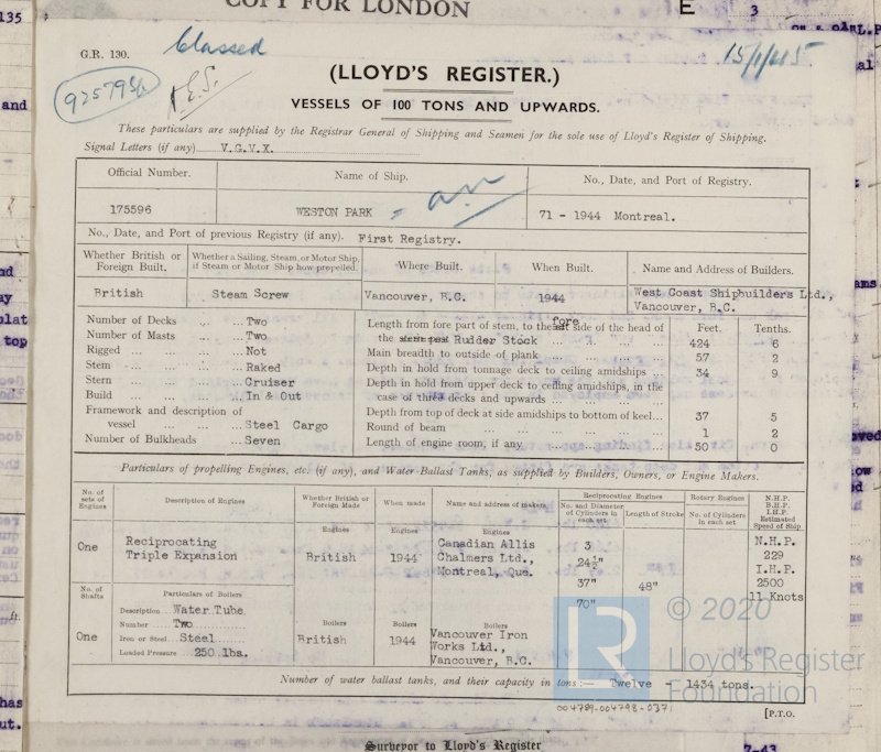 O SS Weston Park foi construído em 1944 nos estaleiros da West Coast Shipbuilders, localizados em Vancouver BC, pela empresa subcontratada Empire Sheet Metal Co. Ltd. A sua propulsão era a vapor, utilizando um motor de tripla expansão. O motor foi construído pela Canadian Allis-Chalmers Ltd., em Montreal, Quebec.