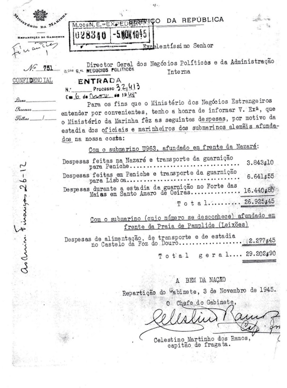 Curiosidade: Na data de 3 de Novembro de 1945 o Ministério da Marinha apresentou ao Diretor Geral dos Negócios Políticos e da Administração Interna uma despesa de 2.277$45 referente à alimentação, transporte e de estadia no castelo da Foz do Douro dos oficiais e marinheiros do submarino, cujo número não foi fornecido e se desconhecia.